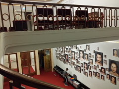 Im Treppenhaus mit Blick auf die Fotowand mit den Portraits der Ensemble Mitglieder